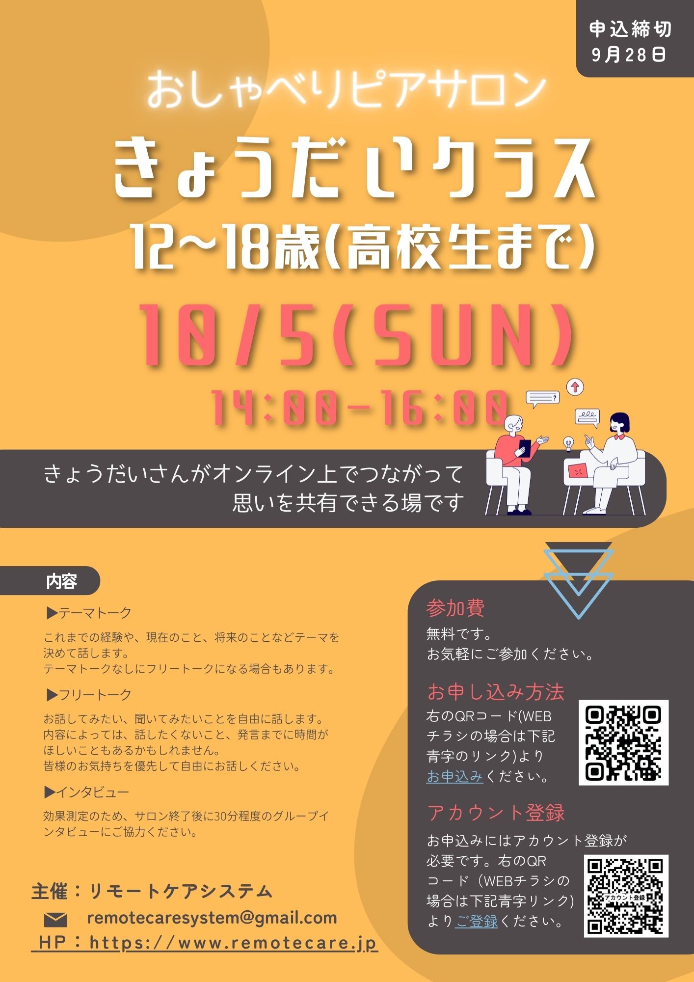きょうだいさんが、同じ立場の仲間と、安心しておしゃべりできるオンラインの集まりです。学校や友達にはなかなか話しにくいことも、ここなら「わかってもらえる」「同じ気持ちの人がいる」と思えるかもしれません。ヤングケアラーの研究をされている小児科医と大学教員がファシリテーター(進行役)を務めます。ご自宅から、お気軽にご参加ください。【日 時】2025年10月5日(日)14:00~16:00【場 所】オンライン(ZOOMにて)【参加費】文部科学省の科研費助成を受けているため、無料でご参加いただけます。(ピアサロン内での「インタビュー」と「事後アンケート」にご協力ください)【内 容】・テーマトーク:これまでの経験や、現在のこと、将来のことなどテーマを決めて話します。・フリートーク:お話してみたい、聞いてみたいことを自由に話します。内容によっては、話したくないこと、発言までに時間が欲しいこともあるかもしれません。皆様のお気持ちを優先して自由にお話しください。・インタビュー:終了後に30分程度のグループインタビューにご協力ください。【お申込み】お申込みにはモニター登録が必要です。①https://www.remotecare.jp/apply-carer/より、「リモートケアシステム」のサイトからアカウント(ケアラー)に登録②システムにログイン後、https://www.remotecare.jp/peer-salon/より、「ピアサロンきょうだいクラス(12歳~18歳(高校生まで))」へお申込みください。【ウェブチラシはこちら】ウェブチラシのリンクからもお申込みいただけます。【締 切】2025年9月28日(日)